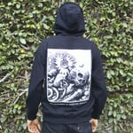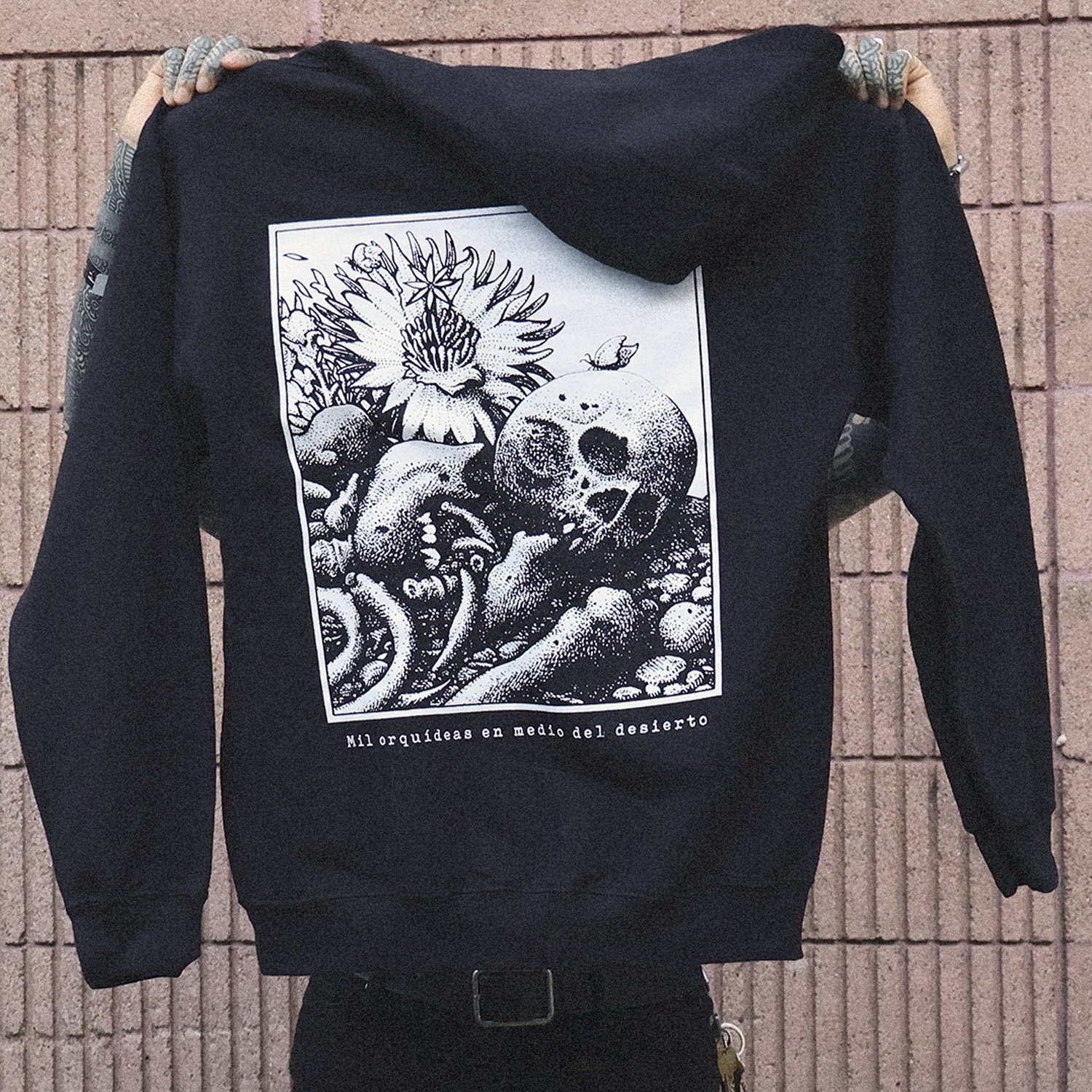 Black hoodie with logo on front and "Mil Orquídeas" design on back.